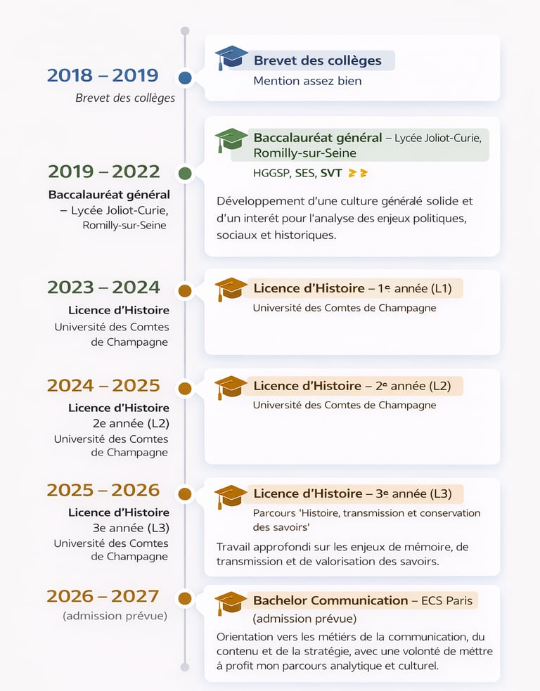 Je m’appelle Gabriel , j’ai 21 ans et je suis titulaire d’une licence d’Histoire. Cette formation m’a permis de développer de solides compétences en analyse, en recherche et en synthèse, ainsi qu’une bonne capacité à structurer des idées et des discours.