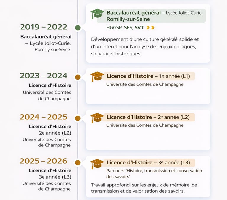 Je m’appelle Gabriel , j’ai 21 ans et je suis titulaire d’une licence d’Histoire. Cette formation m’a permis de développer de solides compétences en analyse, en recherche et en synthèse, ainsi qu’une bonne capacité à structurer des idées et des discours.